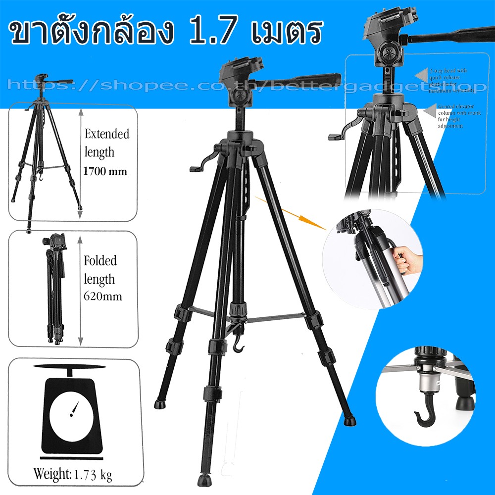 ขาตั้งกล้อง 1.7 เมตร มาพร้อมที่แขวนถุงสัมภาระเพื่อถ่วงน้ำหนักให้ขาตั้งไม่ขยับเมื่อเจอลมพัด พร้อมทั้งที่จับยกขาตั้งเพื่อให้เคลื่อนย้ายสะดวก สามารถรับน้ำหนักได้สูงสุด 1.7 กิโล ปรับระดับความสูงได้สูงสุดถึง 1.7 เมตร เหมาะสำหรับคนรักการถ่ายรูปเป็นอย่างมาก ขาตั้งกล้อง ขาตั้งกล้องถ่ายรูป BTG Tripod monopod ขาตั้ง_กล้องถ่ายรูป อุปกรณ์ถ่ายรูป อุปกรณ์ถ่ายภาพ
