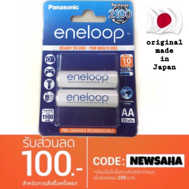 - ถูกที่สุด ถ่านชาร์จ Panasonic Eneloop AA (แพ็ค2ก้อน)1.2V 1,900 mAh แท้100% ทนมากชาร์จได้สูงสุดกว่า 2,100ครั้ง ซื้อเลยตอนนี้