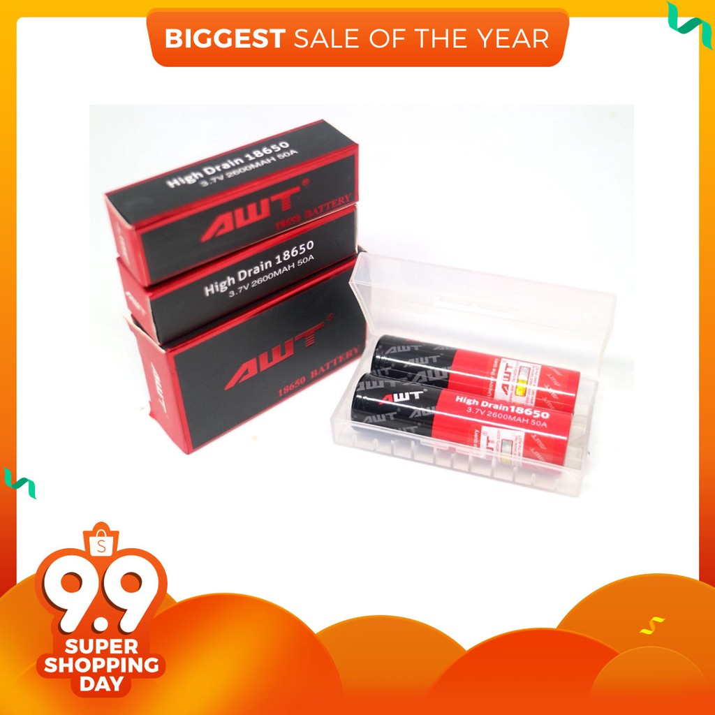 ★ลดราคา ถ่านชาร์จ AWT 18650 แดงดำ 2600 mAh 50 A แพคคู่ ของแท้ ฟรีกล่องใส่ถ่าน 1 ใบ