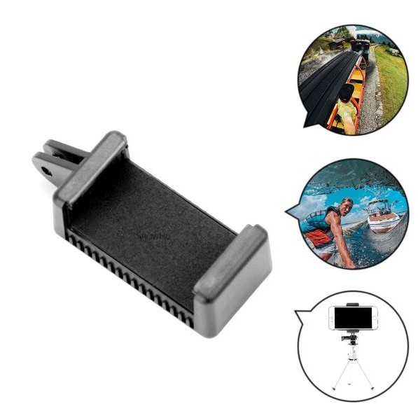 Phone Holder Mount Gopro Selfie ที่ยึดสมาร์ทไฟน เข้ากับไม้เซลฟี่และอุปกรณ์โกโปร อุปกรณ์ยึดโทรศัพท์มือถือ/สมาร์ทโฟน เพื่อต่อเข้ากับอุปกรณ์ของกล้องโกโปร เช่น ไม้เซลฟี่ ขาตั้งกล้อง Tripod Mount และฐาน Base ต่างๆ ให้คุณได้ใช้งานได้ง่ายขึ้น และสามารถได้ 2 ฟังก์ชั่น ทั้งกล้อง และโทรศัพท์มือถือ ทำจากพลาสติกสีดำ คุณภาพดี พร้อมทั้งมีโฟมรองมือถือ สามารถใช้ได้กับสมาร์ทโฟนทุกรุ่น / iPhone 4/5s/6s/6+/7/7+/Samsung และอื่นๆ สามารถขยายเพื่อยึดมือถือได้ 55 mm - 85 mm PhoneHoder iPhone Gopro Selfie ที่ยึดมือถือ Selfie โกโปร อุปรณ์กล้องโกโปร Tripod